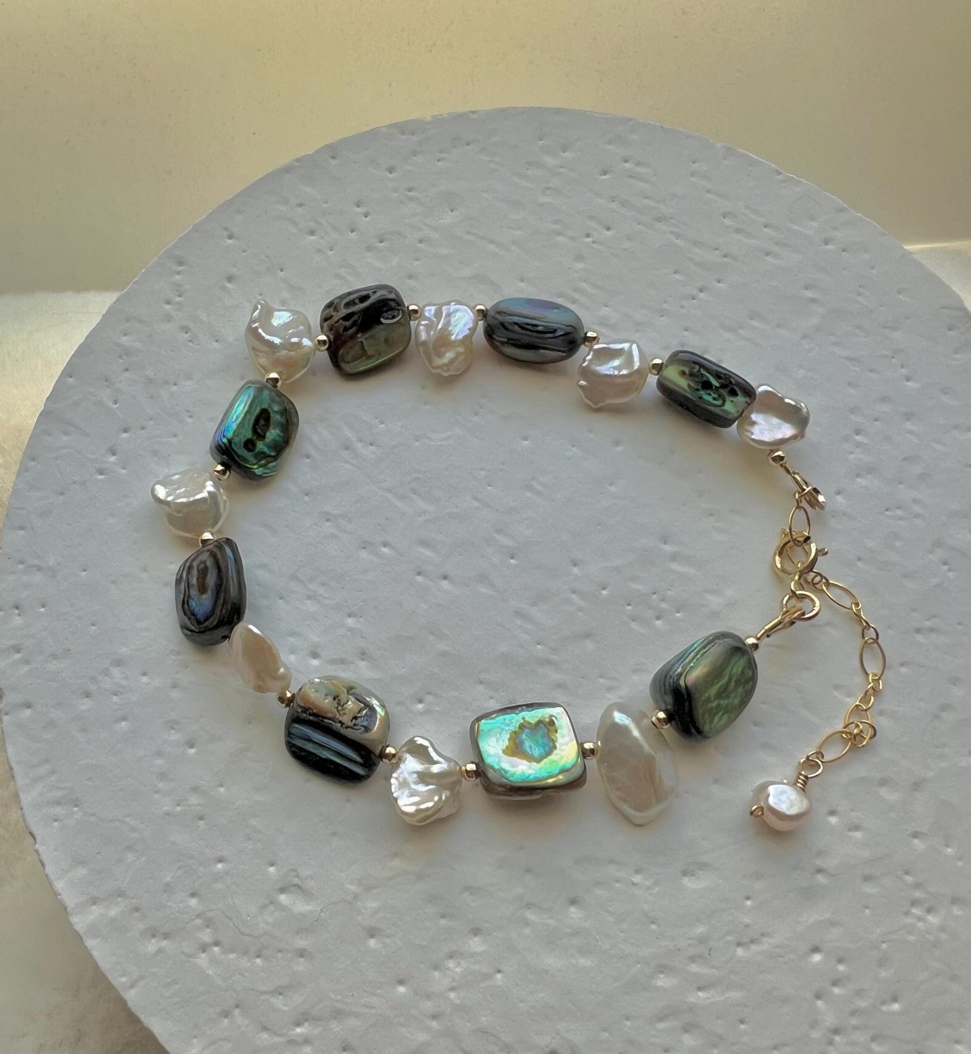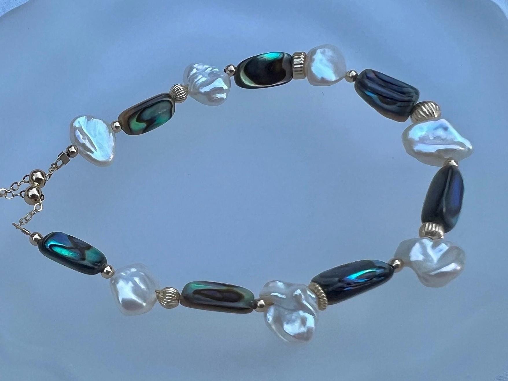 14K gold filled abalone baroque pearl elephant bracelet. Petal pearl bracelet. lightweight bracelet. adjustable bracelet