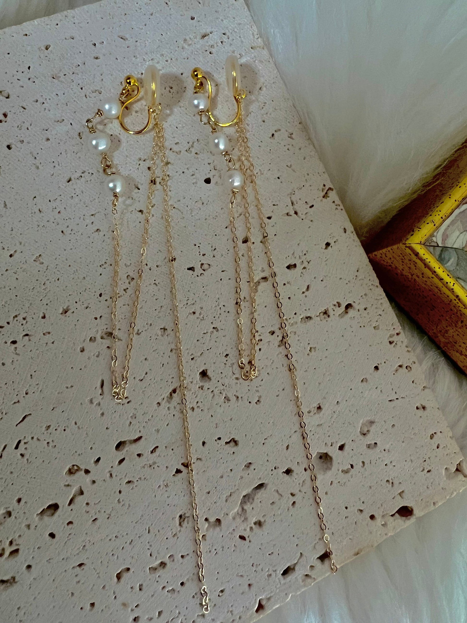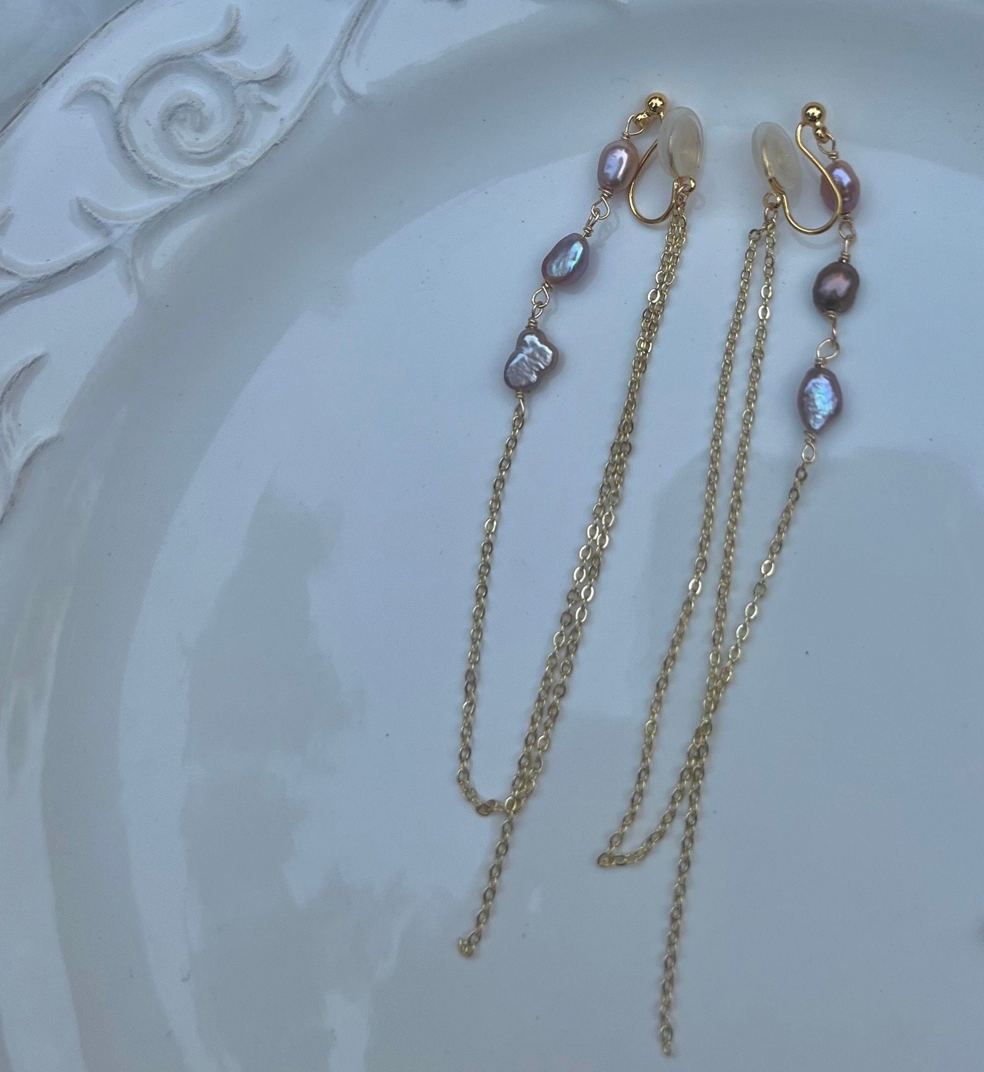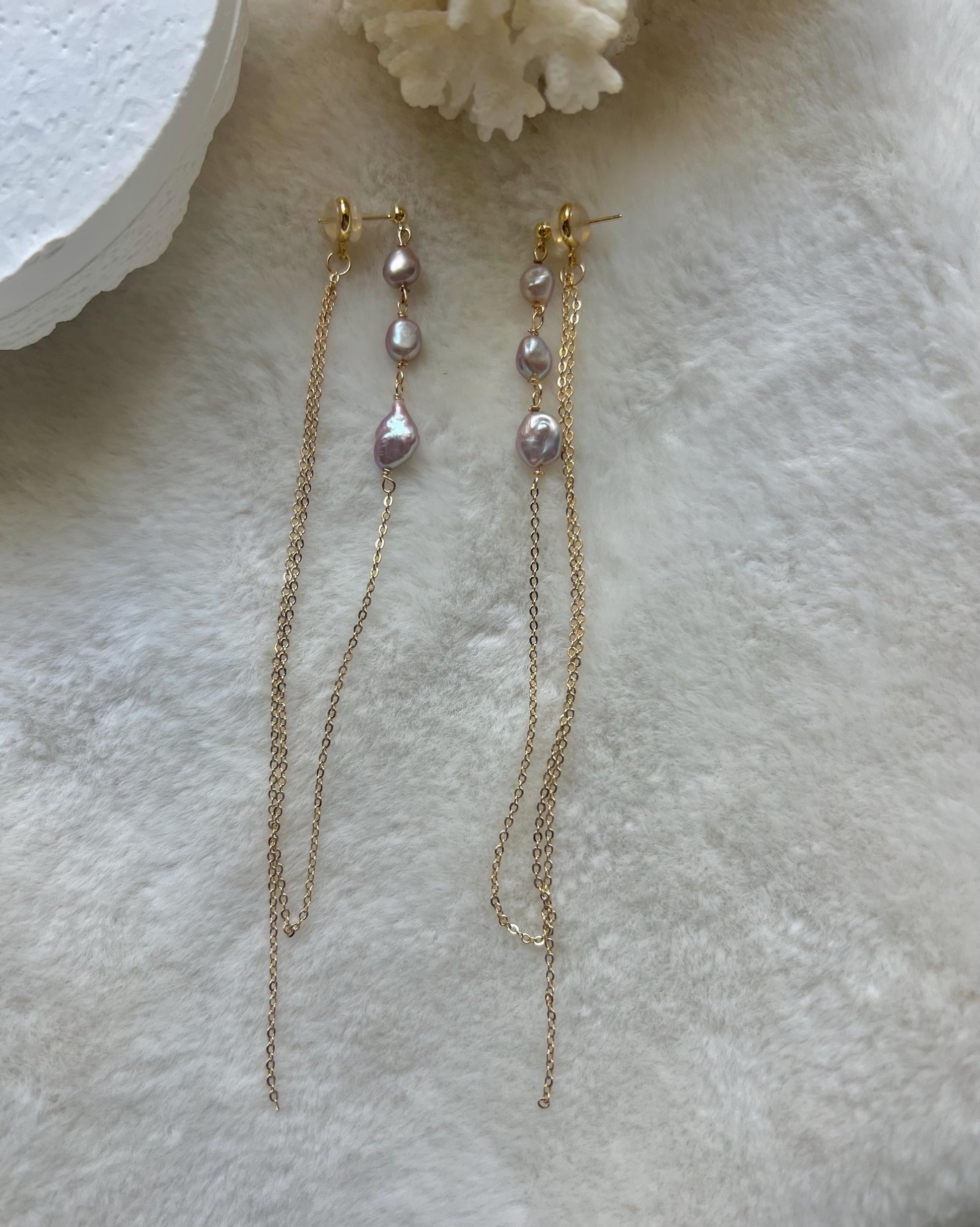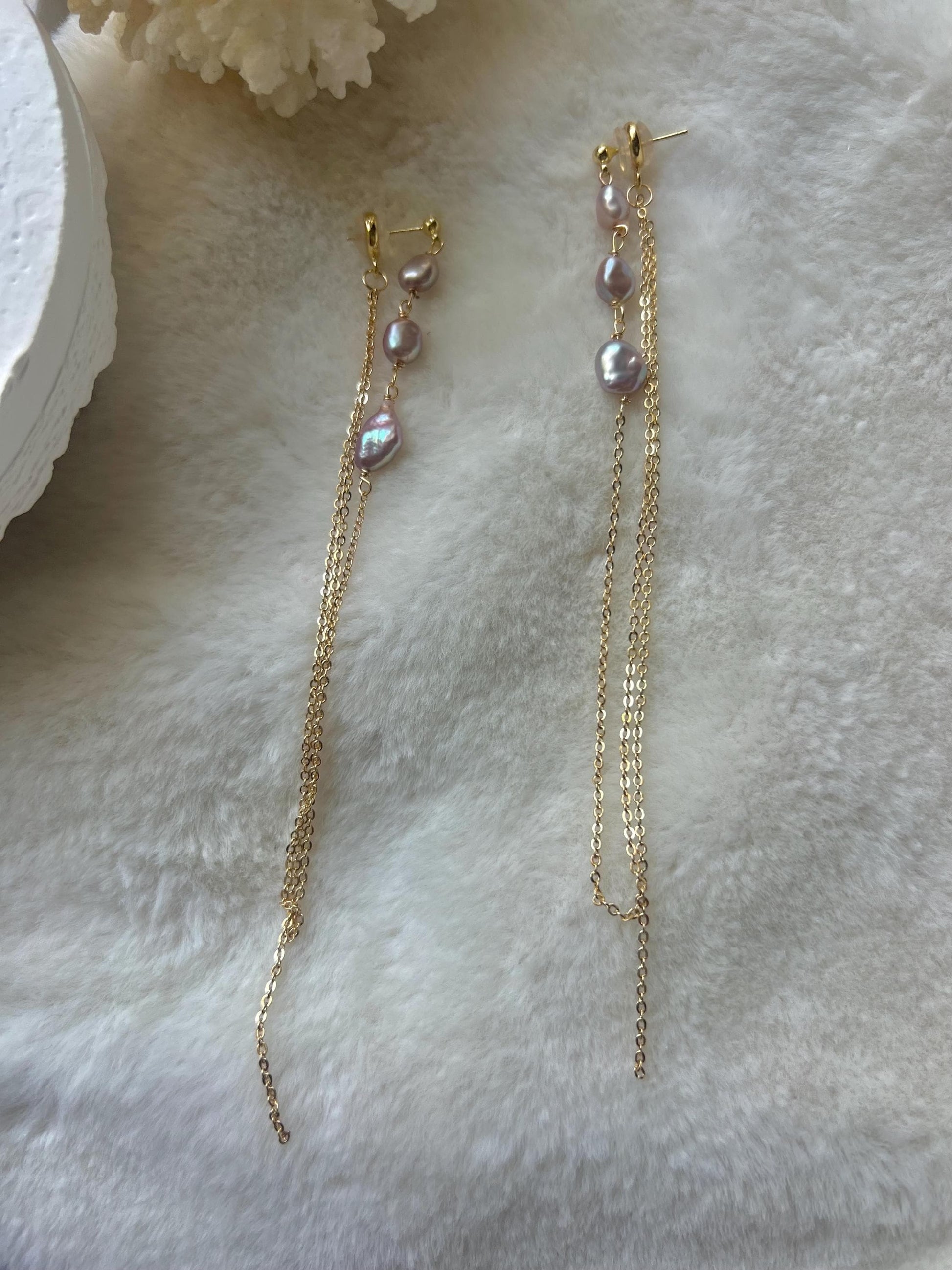 14K gold filled freshwater Pearl ear back dangle tassels earrings. minimalist chain earring. Bridal earring. Bridesmaid gift