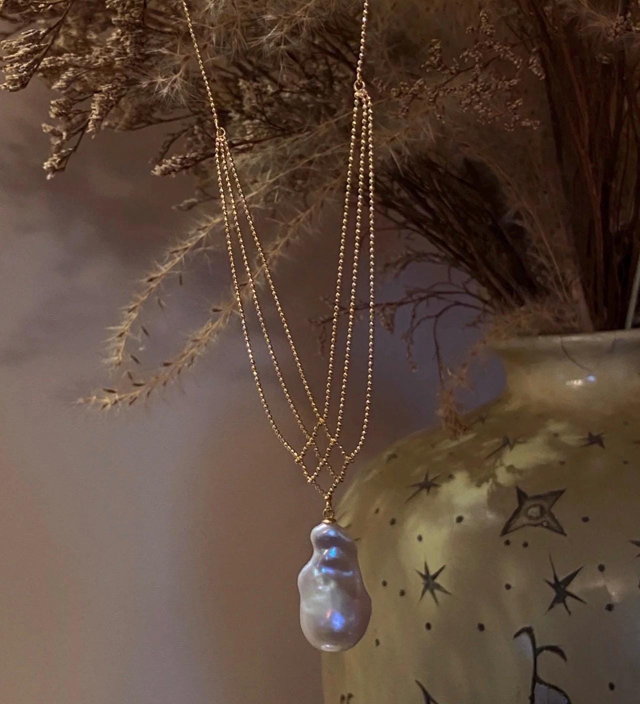14k gold filled freshwater pearl France style double chain elegant dangle necklace. Wave necklace. Bridal necklace.