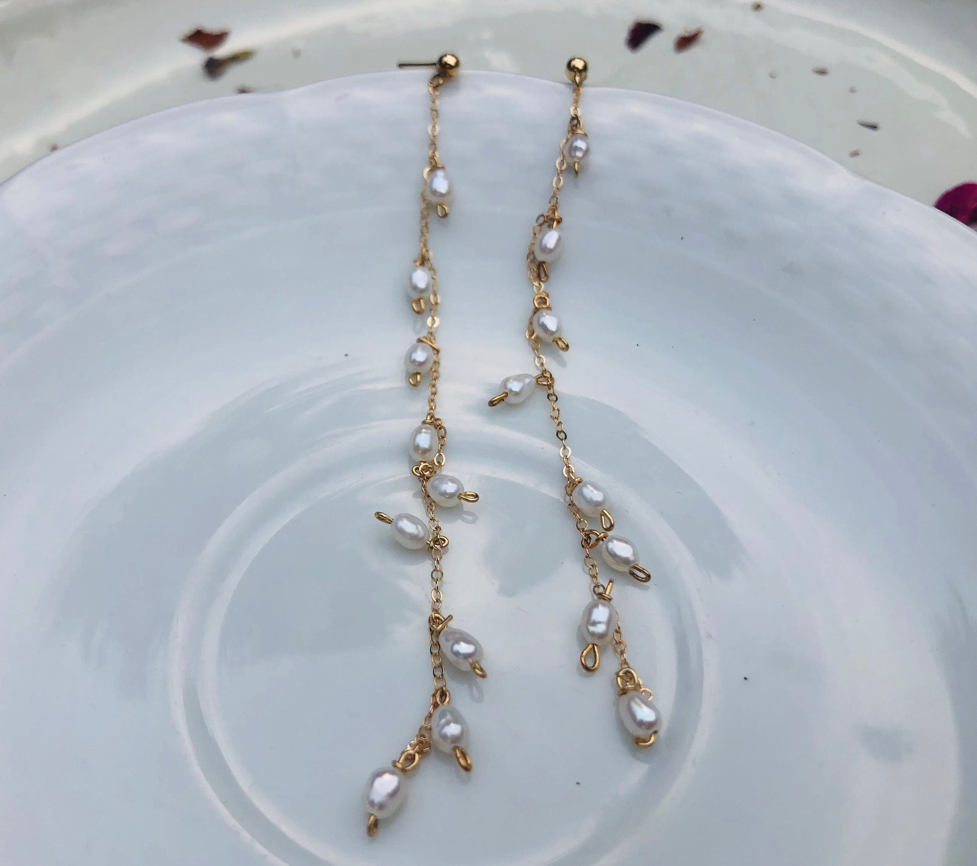 14K gold filled stud long chain dangle pearl earring. Fleurette earring. Bridesmaid gift. Boho wedding pearl earring. Bridal earring.