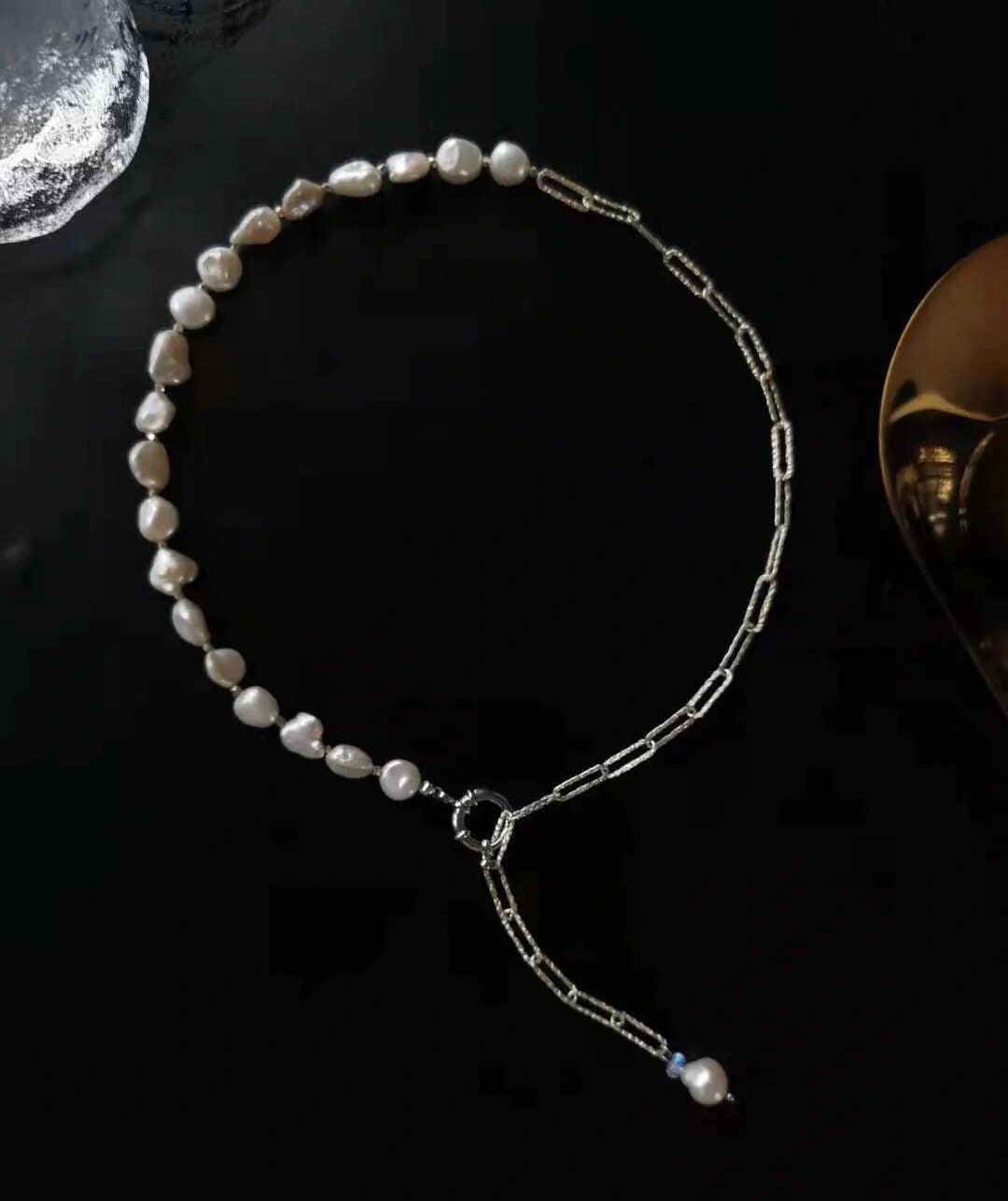 925 sterling silver baroque petal pearl half chain Sparkle charm necklace. Rectangle chain necklace. Minimalist necklace. Chic necklace
