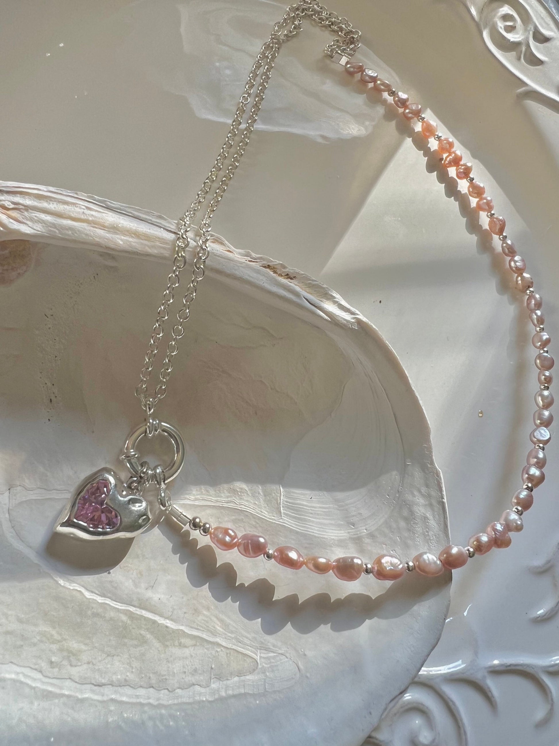 925 sterling silver freshwater pink pearl layered necklace. Heart Necklace. Dainty necklace. Chic pearl necklace.