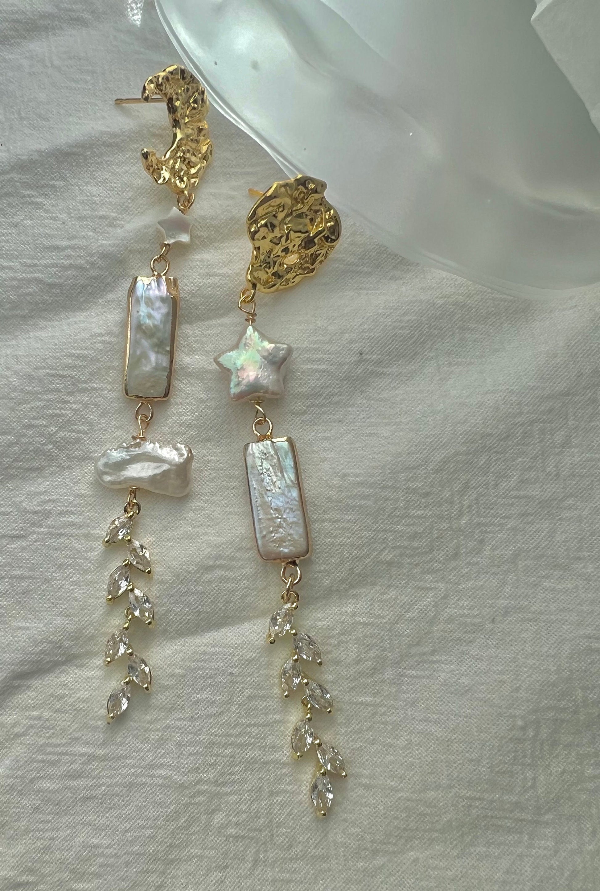 Chic moon star freshwater pearl unbalanced dangle earrings. Designed charm asymmetry earrings. gift for her