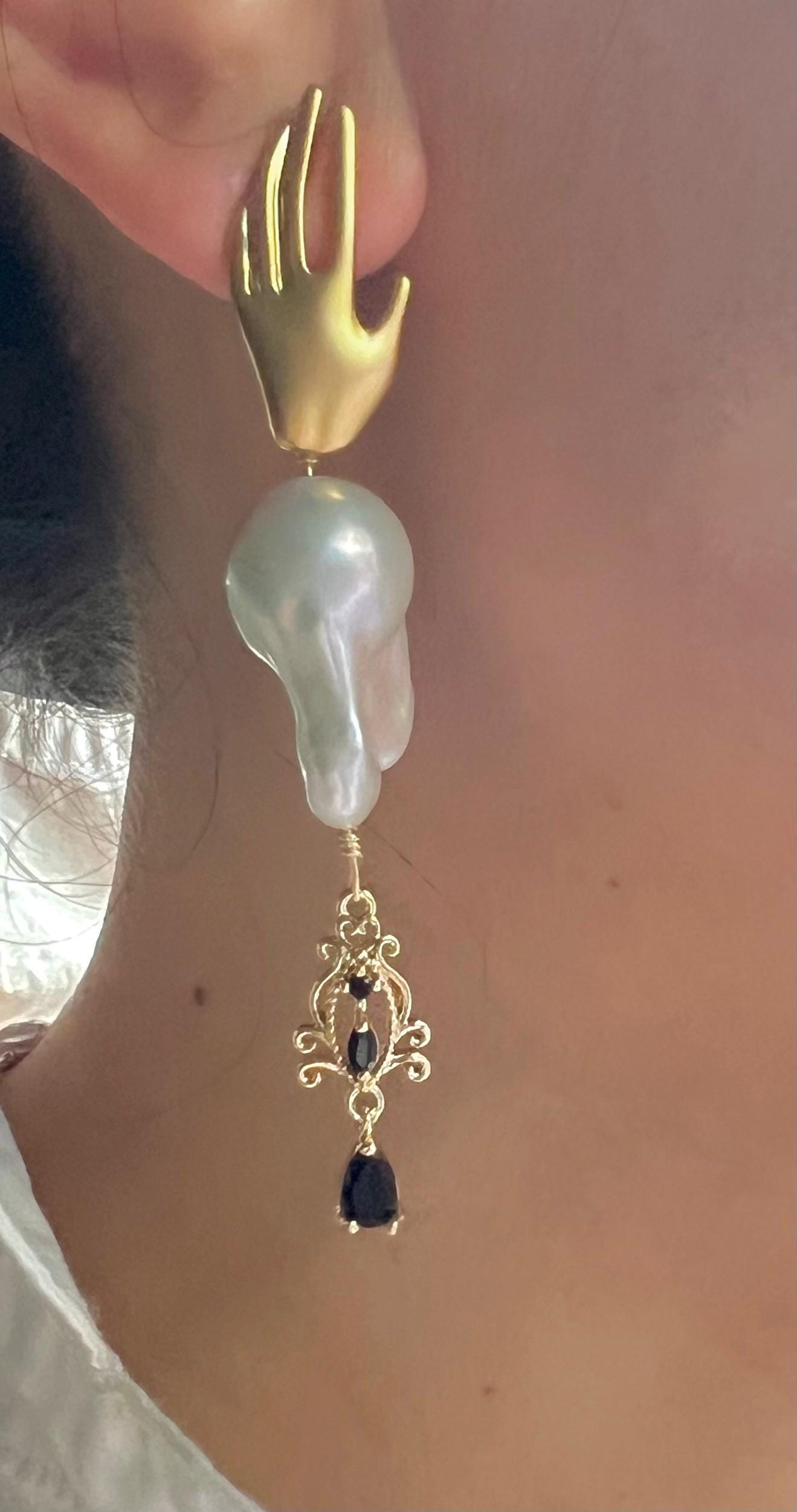 France style freshwater baroque vintage earrings. Gold hand design earrings. Boho luxe earring. Art deco earrings.