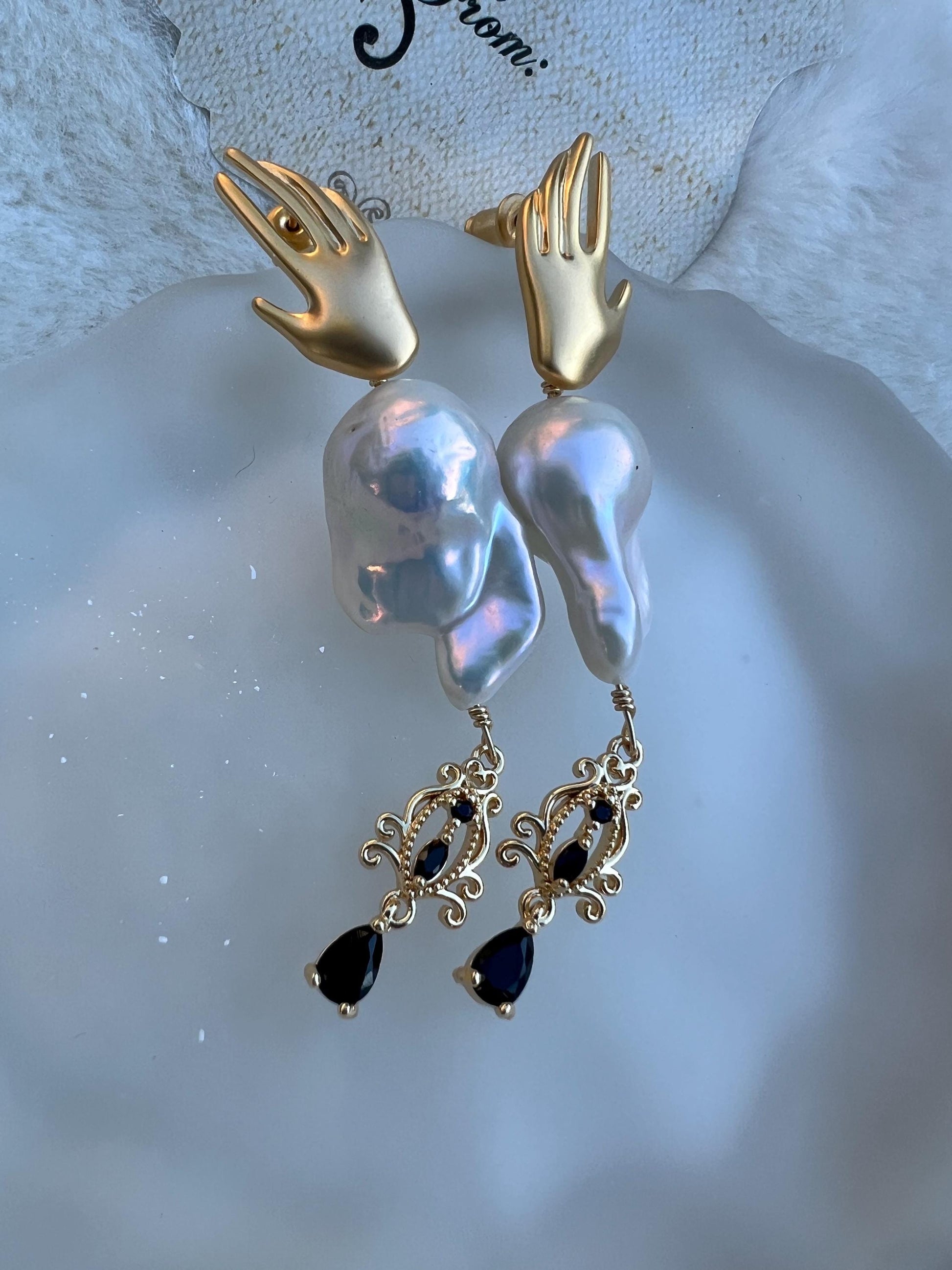 France style freshwater baroque vintage earrings. Gold hand design earrings. Boho luxe earring. Art deco earrings