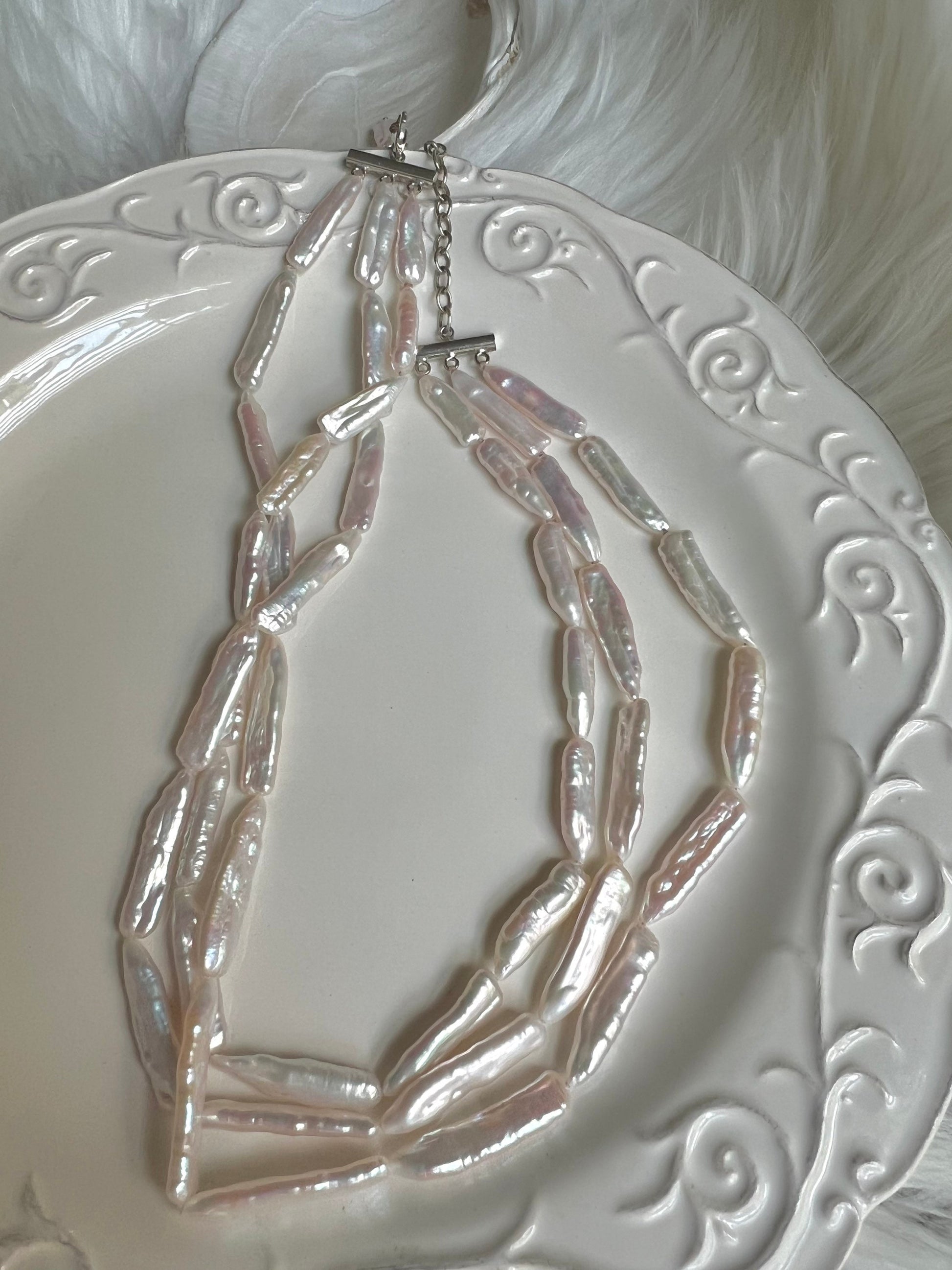 This necklace is so classic. It’s combines triple freshwater keshi pearls .