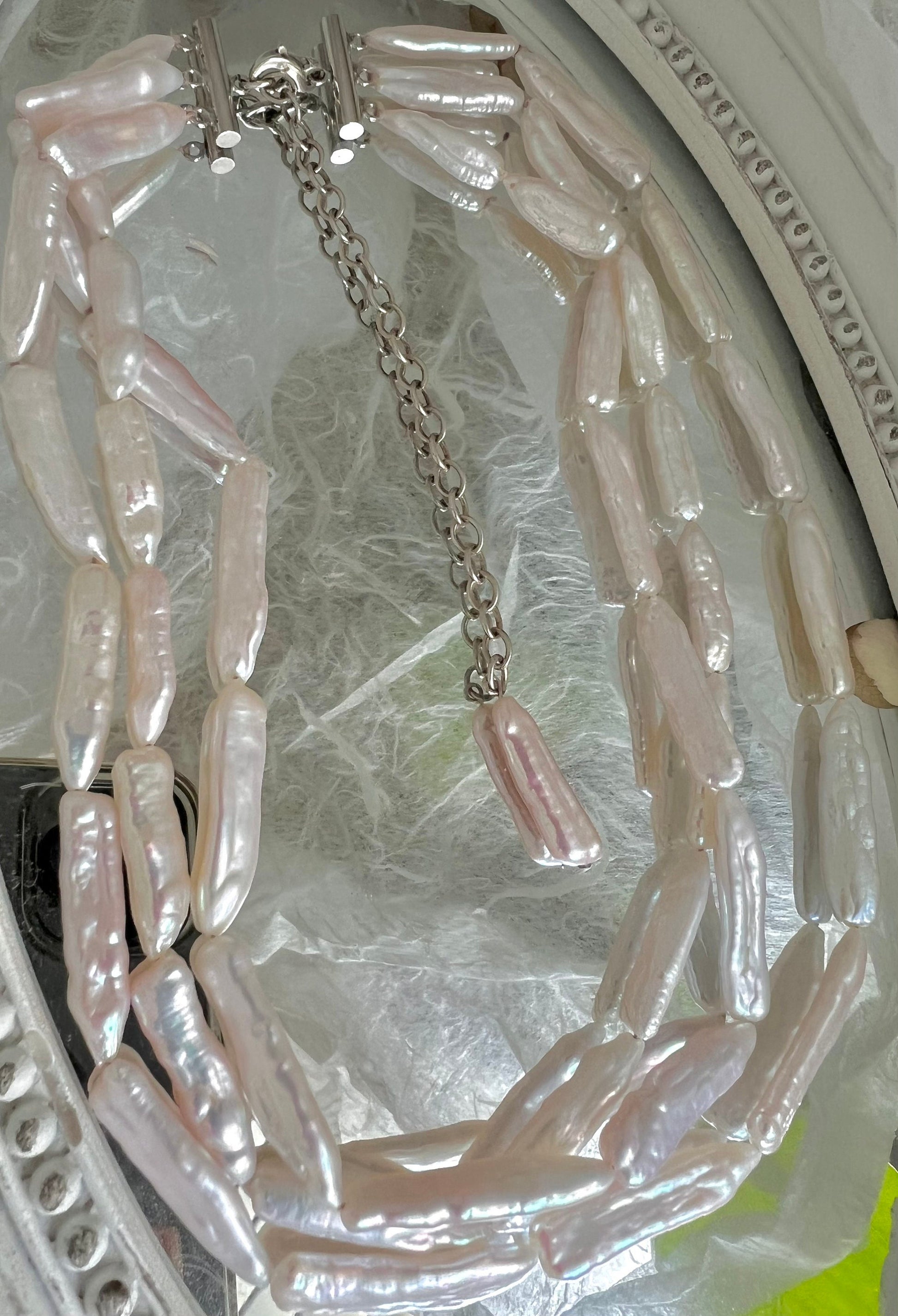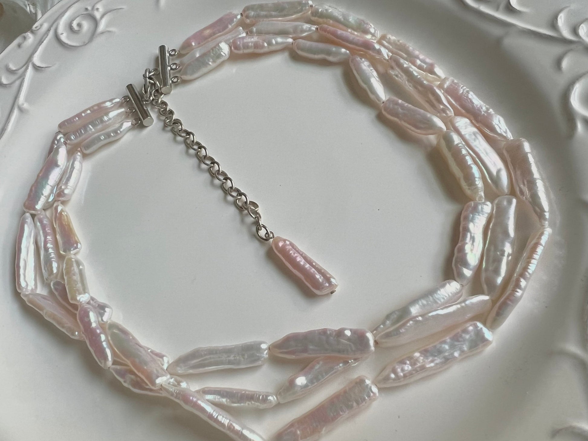 Freshwater keshi pearl triple layered strand necklace. Biwa pearl statement necklace. Boho necklace. OT chunky necklace. Wedding necklace