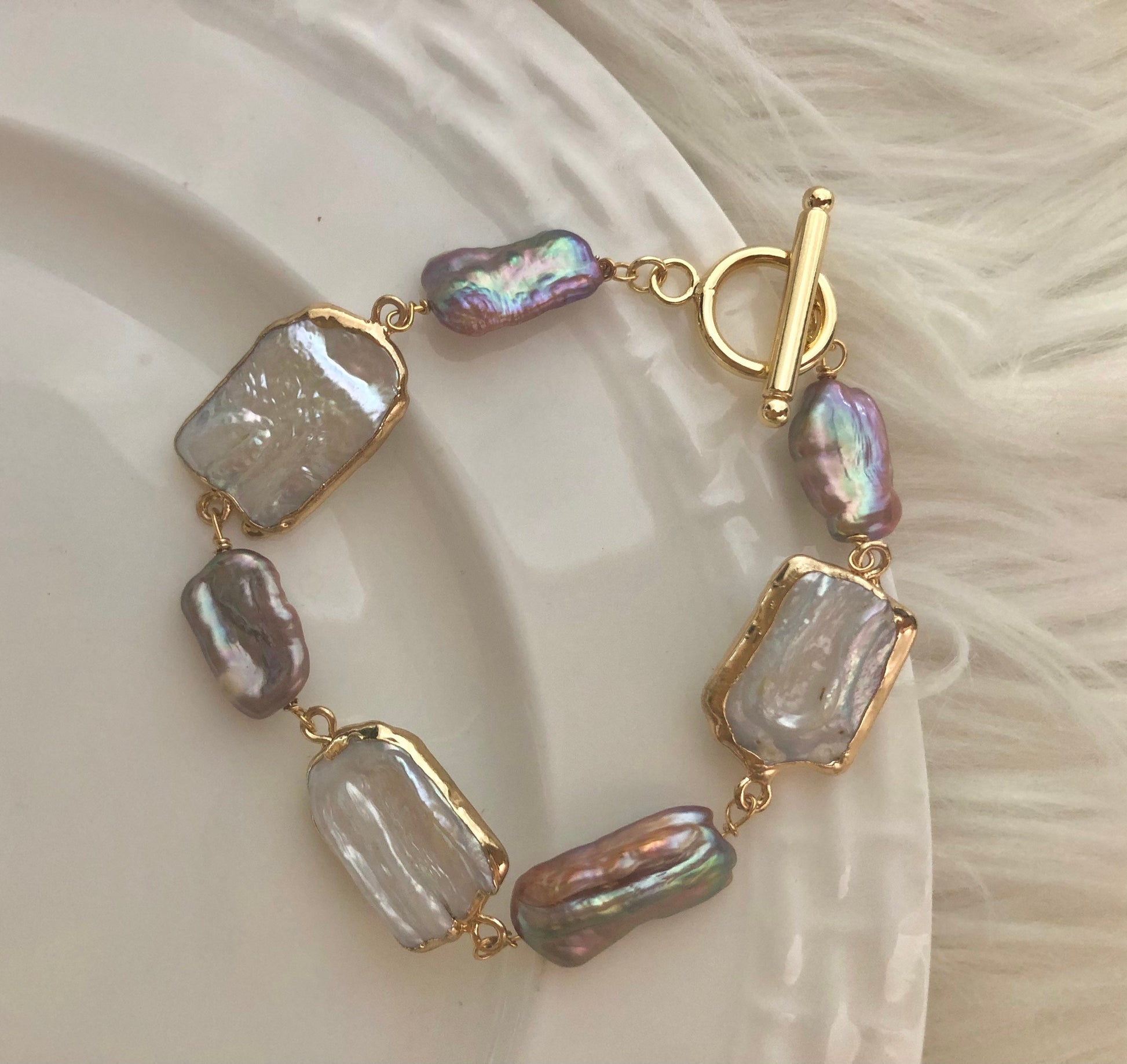 Freshwater multiple-color baroque pearl bracelet. Boho pearl bracelet. June birthstone. High luster pearl biwa bracelet. Chunky bracelet.