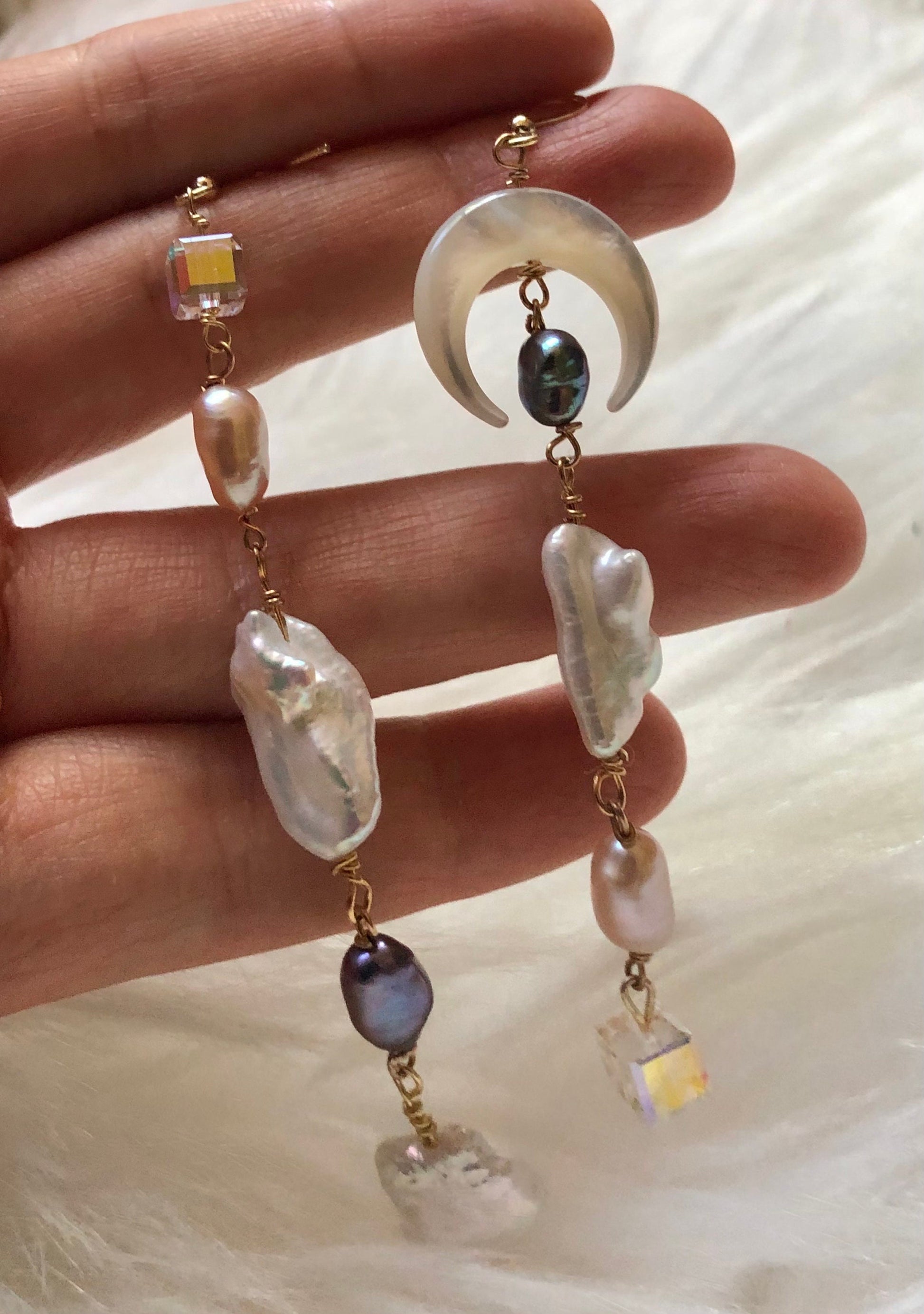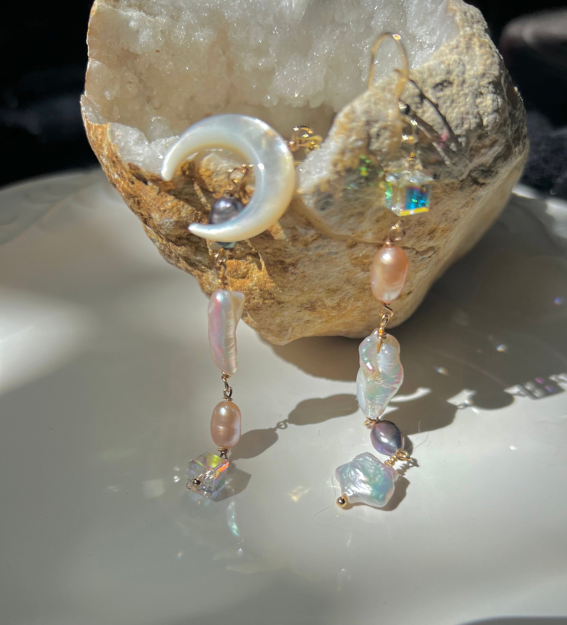 Multicolored multi-shape freshwater baroque pearl earring. Moon and star earrings. Crystal dangle Bridal earrings. Space sparkle earrings.