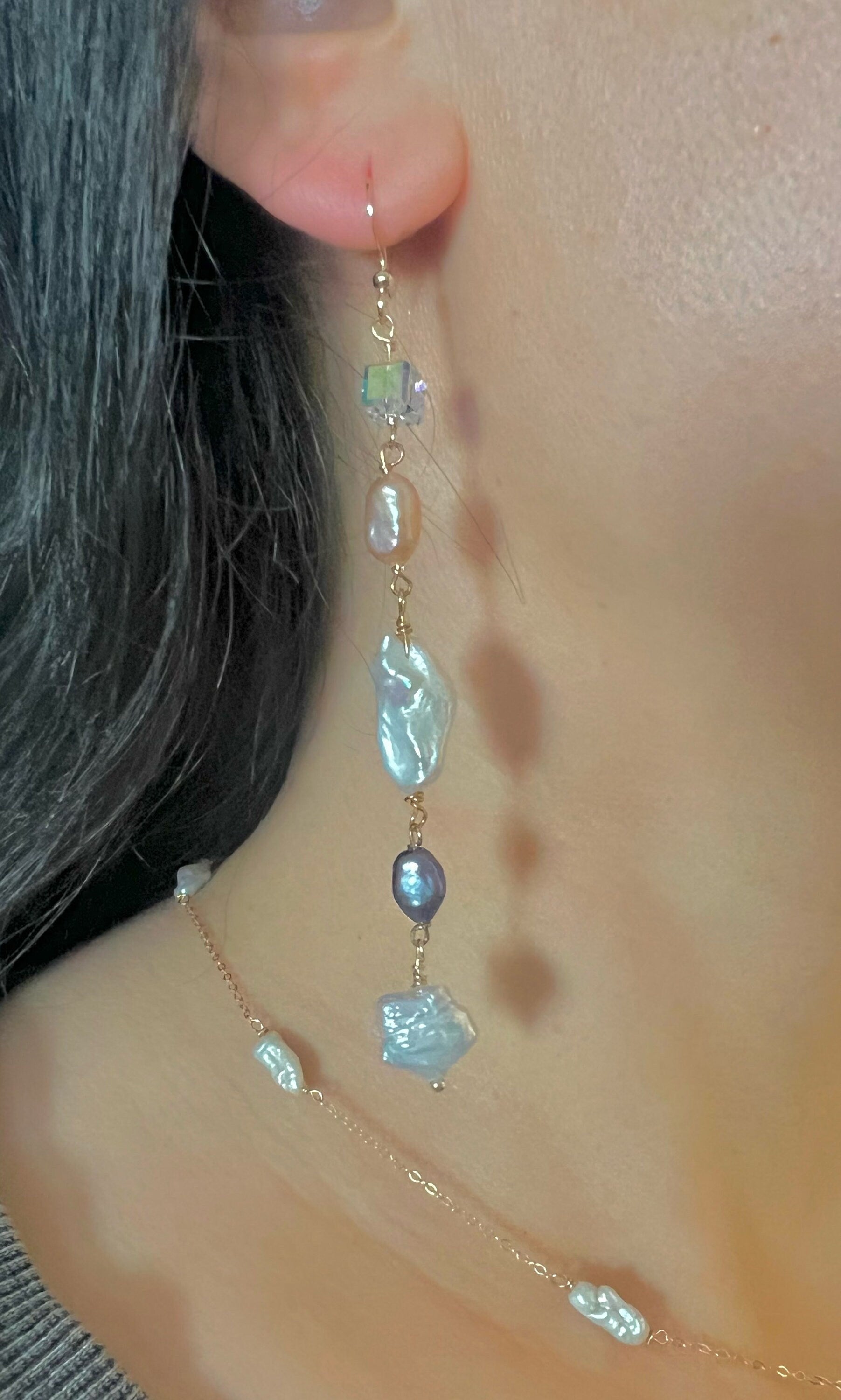 This unbalanced pair of unique and chic dangle earrings are made with beautiful baroque multi shapes multicolored freshwater pearls and swarovski crystal beads. They are perfect for bridal earrings or daily wear. And suitable for daily occasions. They are perfect for wedding occasion or any special occasions.